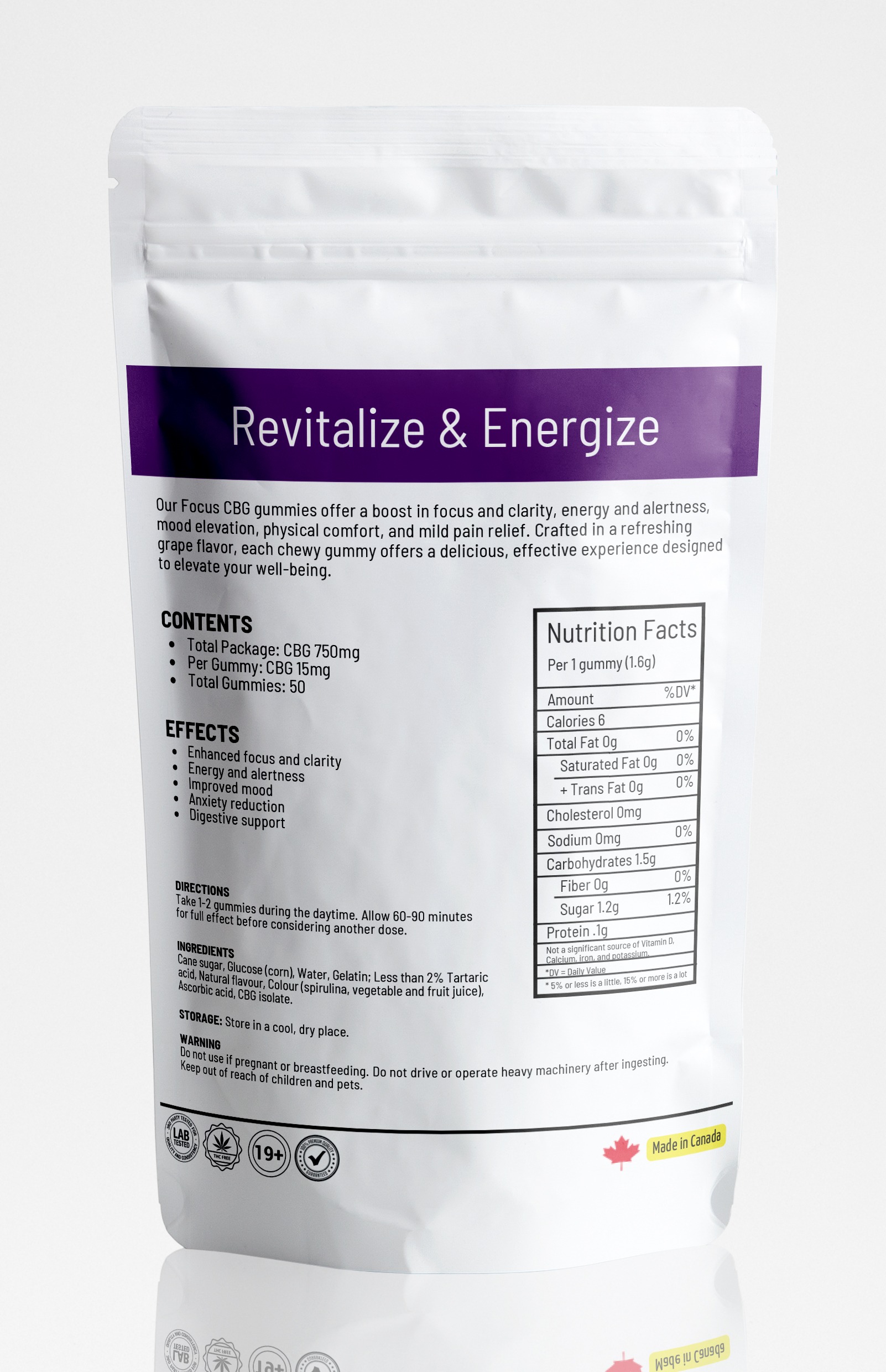 Our Focus CBG gummies offer a boost in focus and clarity, energy and alertness, mood elevation, physical comfort, and mild pain relief. Each chewy gummy offers a delicious, effective experience designed to elevate your well-being.